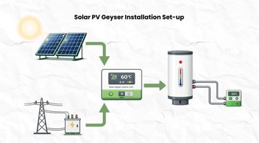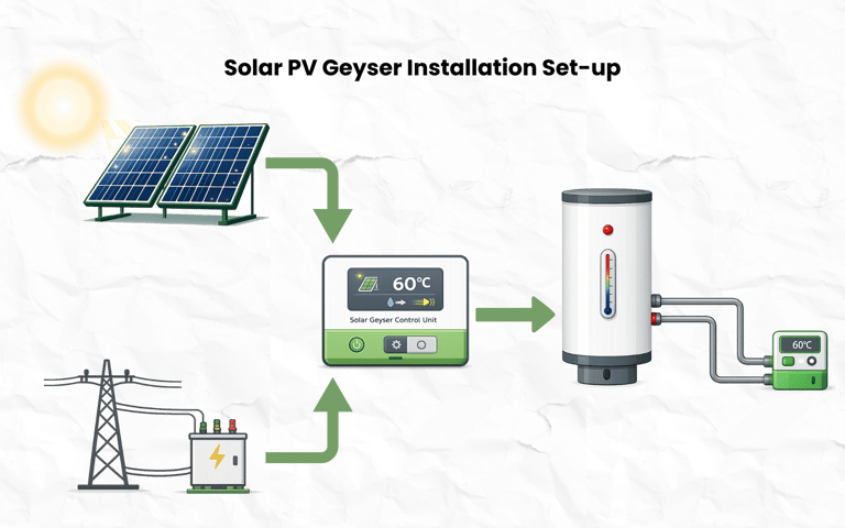 A Solar PV geyser conversion is a focused solar installation aimed at reducing the amount of electricity used for domestic water heating provided by the grid. The system integrates solar PV panels with an existing electric geyser, allowing water to be heated in one of three ways: exclusively using solar energy from the panels, using a combination of solar and grid power, exclusively using power from the grid.